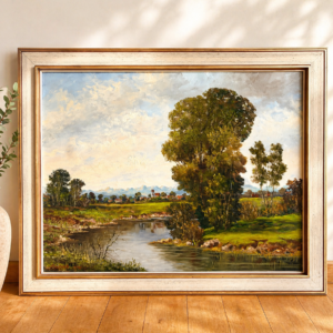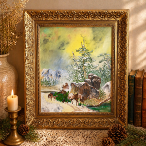 Rozměry: 108 x 40 cm (v x š) Olejomalba na plátně Dřevěný rám Ruční práce Barva rámu zlatá, krémová Použité spotřební zboží