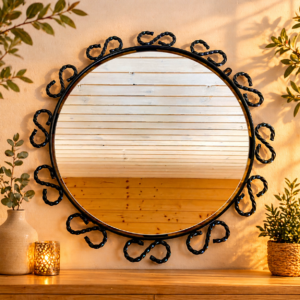 Rozměry zrcadla: 50 cm (průměr) Materiál kov Tvar kulatý  Ruční práce Barva černá Styl rustikální Použité spotřební zboží