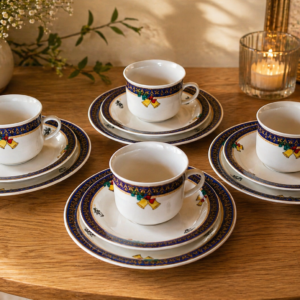 Materiál porcelán  Servis pro čtyři osoby Ruční práce Barva: různobarevná  Styl rustikální Počet ks 12  Použité spotřební zboží